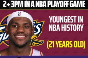 据统计,詹姆斯(41岁116天)季后赛单场至少25分10篮板5助攻2三分,NBA历史最老,最年轻也是他。