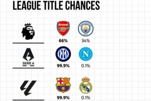 【相关】五大联赛争冠形势:枪手曼城胶着,巴萨、国米均最快下轮夺冠
