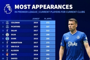 现役球员当前俱乐部英超出场榜:科尔曼、皮克福德、萨拉赫前三