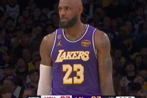 比赛最后时刻,湖人落后4分,詹姆斯在还剩15秒的时候在三分线外抢投三分但可惜磕筐打铁。