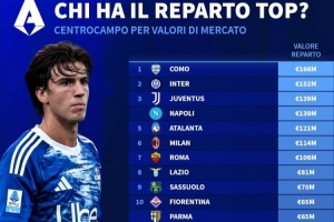 德转列意甲各队中场总身价排行:科莫1.66亿欧居首,国米第二