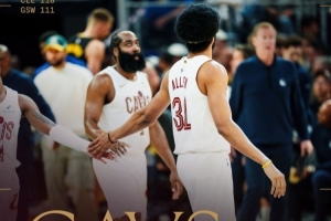 赛后骑士官方晒出本场赢球海报,哈登和贾勒特·阿伦登上封面。