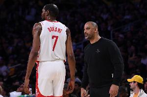 赛后,杜兰特接受了记者采访。谈到自己9个失误,他说道:“我的意思是,他们从第一个回合就开始包夹我了,我觉得我必须做得更好,不要在分球时让我的队友陷入被动的局面,有时候我可以破解包夹,杀向篮下,让他们的投篮更轻松一些,或者我自己投篮。我也要尝试传球,尝试做出正确的分球,但有时我觉得我应该更多地出手投篮,让我的队友处于更有利的位置,我觉得我们还是得到了一些不错的出手机会,我们三分球命中率24%,整体投篮命中率40%。