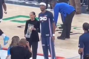 雷霆球星亚历山大赛前领取了本赛季最佳关键球员奖杯!