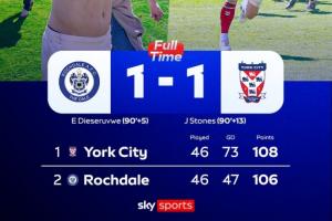 体育资讯04月25日讯 英格兰全国联赛(第5级别)最后一轮,榜首球队直接交锋上演神剧情,罗奇代尔第95分钟绝杀,约克城第103分钟绝平,约克城升入英乙,赛季取得106分的罗奇代尔只能去参加残酷的附加赛。