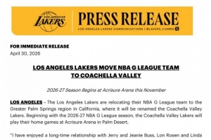 体育资讯5月1日讯 洛杉矶湖人宣布将球队下属G联盟球队迁至科切拉谷 (Coachella Valley),科切拉谷位于加州的大棕榈泉地区(Greater Palm Springs)。新赛季主场也将移师棕榈沙漠(Palm Desert)的Acrisure体育馆。